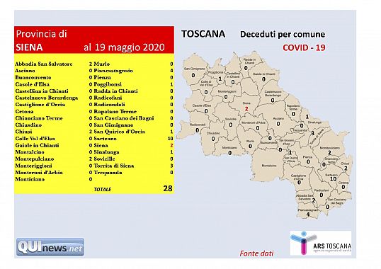 Nelle ultime 24 ore c'è stato un nuovo contagio in provincia di Siena. Non si registrano decessi, l'ultimo risale al 6 maggio scorso